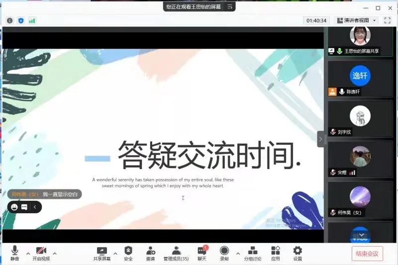 会议最后,是答疑交流时间,学长学姐们针对新生提出的问题进行详尽的解答。本次线上会议的召开,使2021级信管新生们对学校、学院的各项规章制度有了更进一步的了解,也对同学彼此之间有了更深一步的认识,希望新生们做好充分的准备,以最饱满的精神状态相聚黑大!(KYTY.COM开云体育(中国)科技公司供稿)