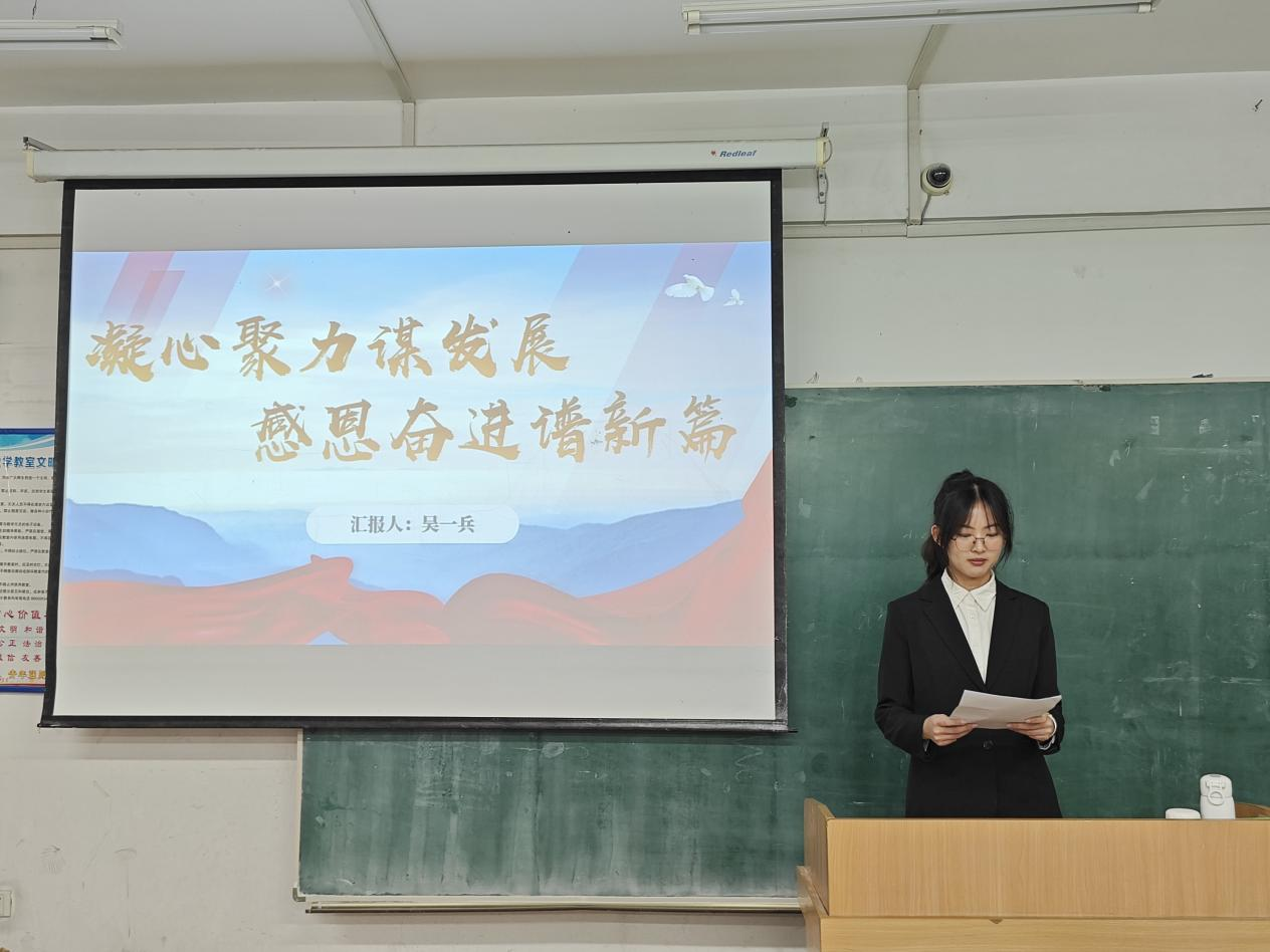 在集中学习的开始,吴一兵同学再一次讲述习近平总书记在考察黑龙江时做出的重要嘱托和殷切期望。随后她讲解了黑龙江省在东北振兴应当发挥农业优势、生态优势、人力资源、金融工作、科技创新等多方面的积极作用,做到全力发展,促进东北振兴。作为当代青年应当将习近平总书记的嘱托记在心里,主动作为、奋发有为,决不能甘于落后、安于现状。深入学习领会四中全会精神并贯彻落实,坚持正确的方向,以思想为指引,始终把建设摆在首位切实做到忠诚、筑牢理论之基,彰显使命担当,做有理想、敢担当、能吃苦、肯奋斗的新时代好青年,为推动东北全面振兴贡献自己的力量。