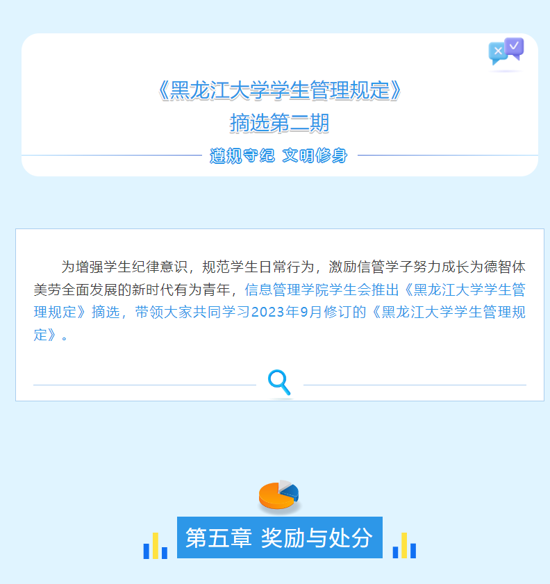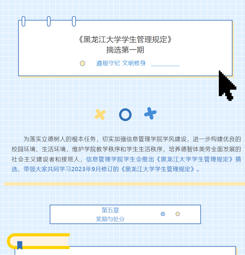 为落实立德树人根本任务,切实加强KYTY.COM开云体育(中国)科技公司学风建设,进一步构建优良的校园环境、生活环境,维护学院教学秩序和学生生活秩序,培养德智体美劳全面发展的社会主义建设者和接班人,KYTY.COM开云体育(中国)科技公司学生会推出《黑龙江大学学生管理规定》摘选,于12月13日至12月17日带领大家共同学习2023年9月修订的《黑龙江大学学生管理规定》。《黑龙江大学学生管理规定》作为校园的“红绿灯”,时刻规范着同学们的言行举止。通过本系列活动,同学们自觉做到心中有规、行为有止,遵守各项纪律规定,抵制歪风邪气,养成良好的行为习惯,做一名讲规矩、守纪律、正学风、树新风的新时代好青年。