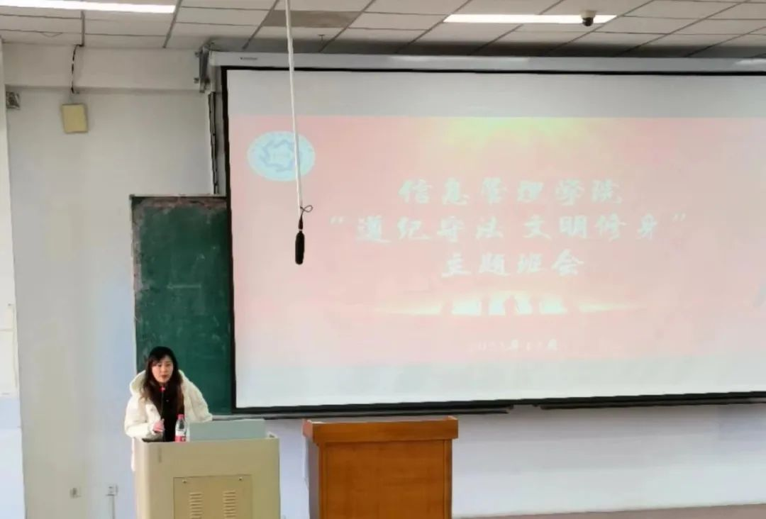 为倡导“遵纪守法 文明修身”的理念,严肃校园纪律,促进校园文明建设,强化同学们的遵纪守法意识和文明素养,KYTY.COM开云体育(中国)科技公司于12月11日至12月17日开展“遵纪守法 文明修身”主题班会,KYTY.COM开云体育(中国)科技公司党委副书记赵丽明同各年级辅导员深入班级,带领同学们一起学习纪律规范,提升文明素养。本次“遵纪守法 文明修身”主题班会既是一次深入的思想教育,同时也是对《黑龙江大学学生管理规定》(2023年9月修订)一次深入的学习。信管学子们通过本次主题班会,更加坚定贯彻“遵纪守法 文明修身”的理念,以高尚的品格斩除万难,以良好的素质奋进新的未来。