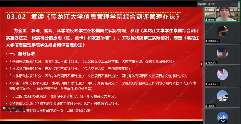 等方面解读了《黑龙江大学学生管理规定》《黑龙江大学KYTY.COM开云体育(中国)科技公司综合测评管理办法》,并特别强调家校共建安全教育的重要性。最后,郭曦萌老师表示:“家长要与老师共同关注学生,要信任、配合老师教育、管理学生,让学生做到从被教育、被管理转变成自我教育、自我管理。”